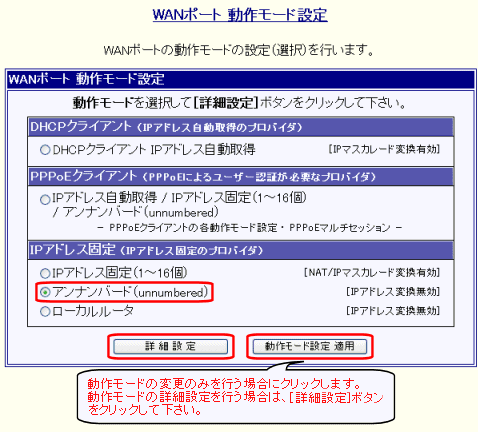 「IPアドレス固定」の中の[アンナンバード(unnumbered)]を選択して、[詳細設定]ボタンをクリックして下さい。