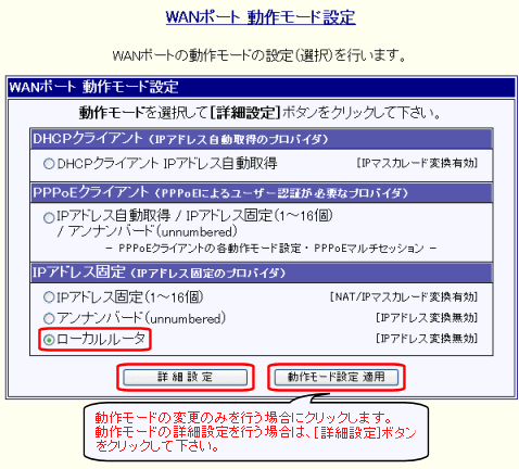 設定画面のメニューの「WANポートの設定」の中の、[WANポート 動作モード設定]をクリックして下さい。