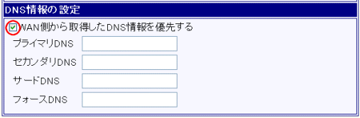 ISPから提供された資料にDNS情報(DNSサーバー・ネームサーバー)がない場合、「WAN側から取得したDNS情報を優先する」にチェックが入ったまま、変更する必要はありません。 |