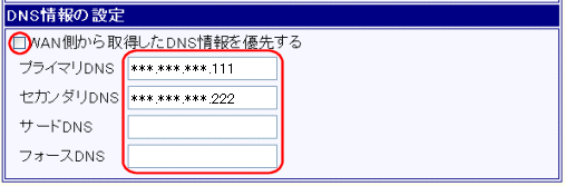 ISPから提供された資料にDNS情報(DNSサーバー・ネームサーバー)がある場合、「WAN側から取得したDNS情報を優先する」のチェックを外した後、資料に載っているDNS情報(DNSサーバー・ネームサーバー)のIPアドレスを入力して下さい。 |