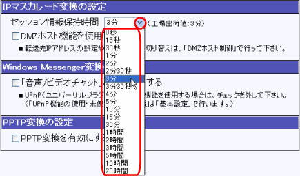 [セッション情報保持時間]を工場出荷値よりも長い時間に設定する場合、インターネットとの通信状況やLAN内のパソコンの台数等を考慮した上で設定するようにして下さい。