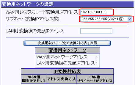 1. [WAN側 IPマスカレード変換用IPアドレス]欄に、ISPから取得した固定IPアドレスを入力し、[サブネットマスク(変換IPアドレス数)]欄から[255.255.255.255(/32・1個)]を選択して下さい。