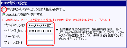 ISPから提供された資料にDNS情報(DNSサーバー・ネームサーバー)がある場合、「WAN側から取得したDNS情報を優先する」のチェックを外した後、資料に載っているDNS情報(DNSサーバー・ネームサーバー)のIPアドレスを入力して下さい。 |