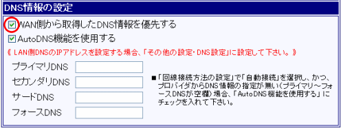 ISPから提供された資料にDNS情報(DNSサーバー・ネームサーバー)がない場合、「WAN側から取得したDNS情報を優先する」にチェックが入ったまま、変更する必要はありません。