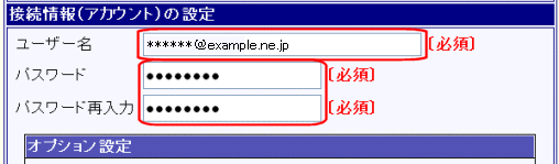 ISPから指定されたユーザー名(接続アカウント、ユーザーID等)を半角英数字で入力して下さい。 |