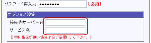 ISPから提供された資料に「接続先サーバー名」「サービス名」を入力するよう指示があった場合にのみ、本設定欄に入力して下さい。 |