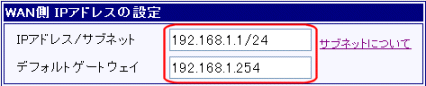 LAN管理者等から提供された資料に載っているIPアドレス(WANポート側に設定するIPアドレス)/サブネット(※)、デフォルトゲートウェイ(WANポート側・他のルータのIPアドレス等)を入力して下さい。